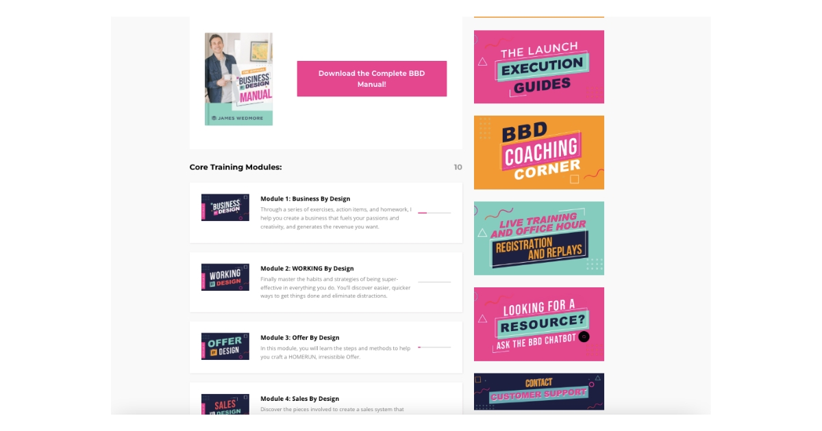 BBD costs $3K, but it’s one of those programs you keep coming back to. It’s updated often, there are plenty of live calls with James every year, as well as office hours with his team to keep you accountable, there’s a big community of like-minded entrepreneurs you’re joining, and many bonuses.
